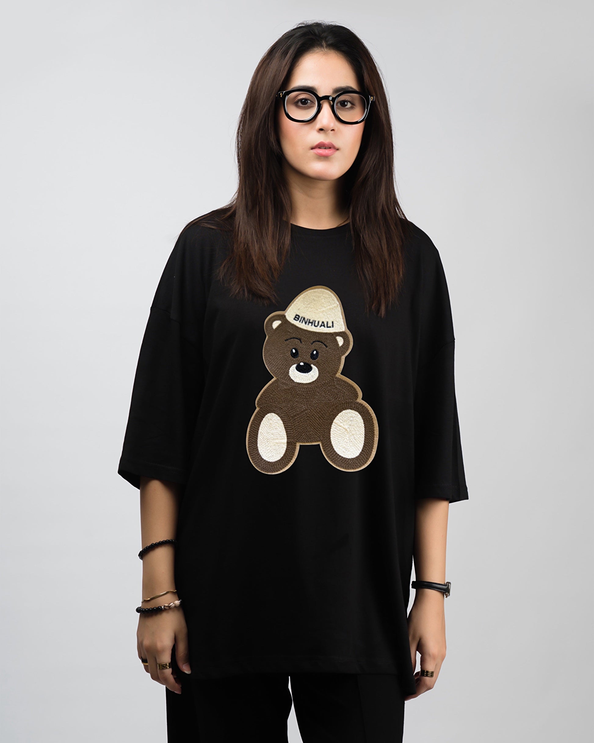 Binhuali Bear Embroidered Patched Drop Shoulder Oversized Tee Black