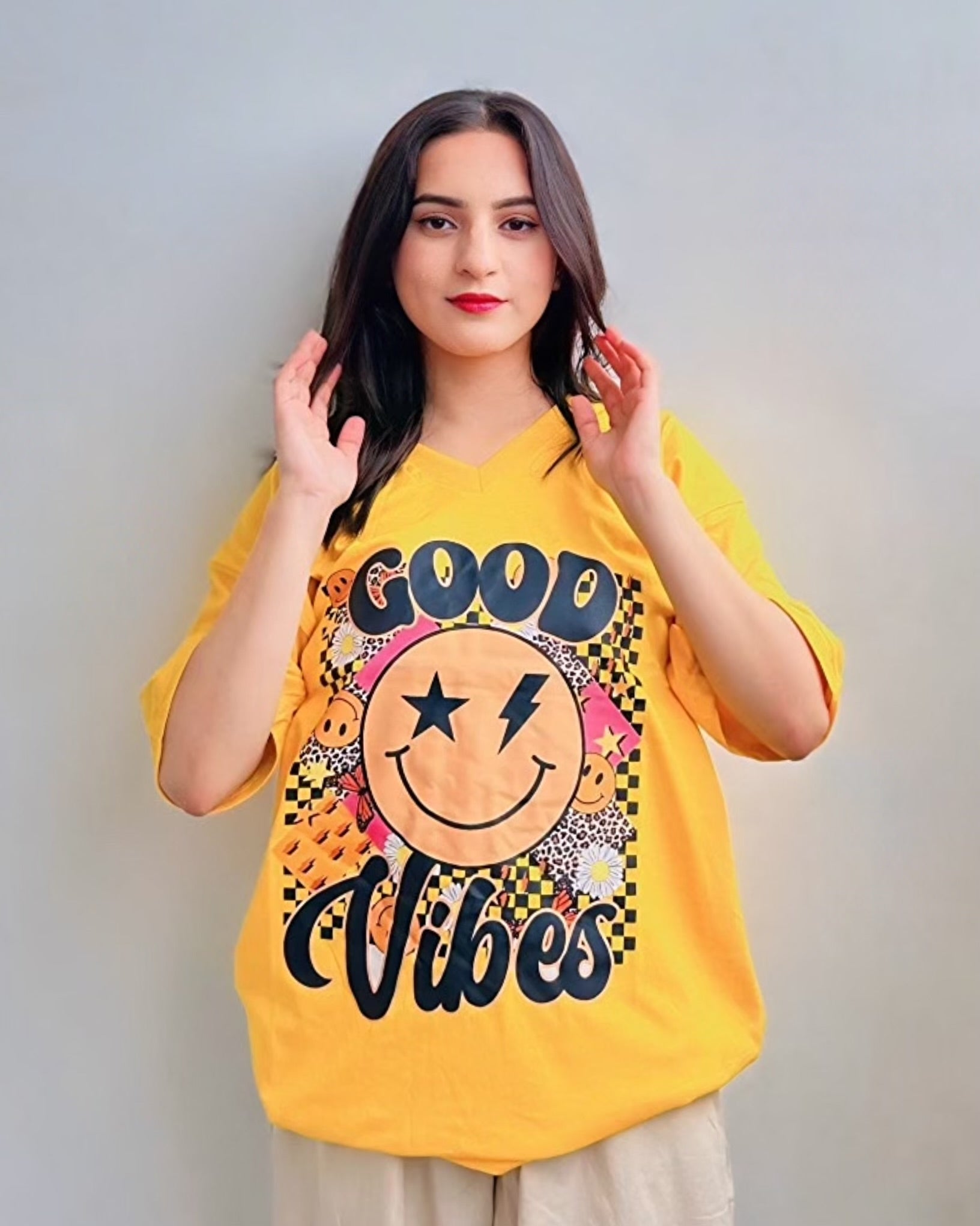 π Good Vibes Graphic Vneck Drop Shoulder Oversized Tee Yellow (100% off)