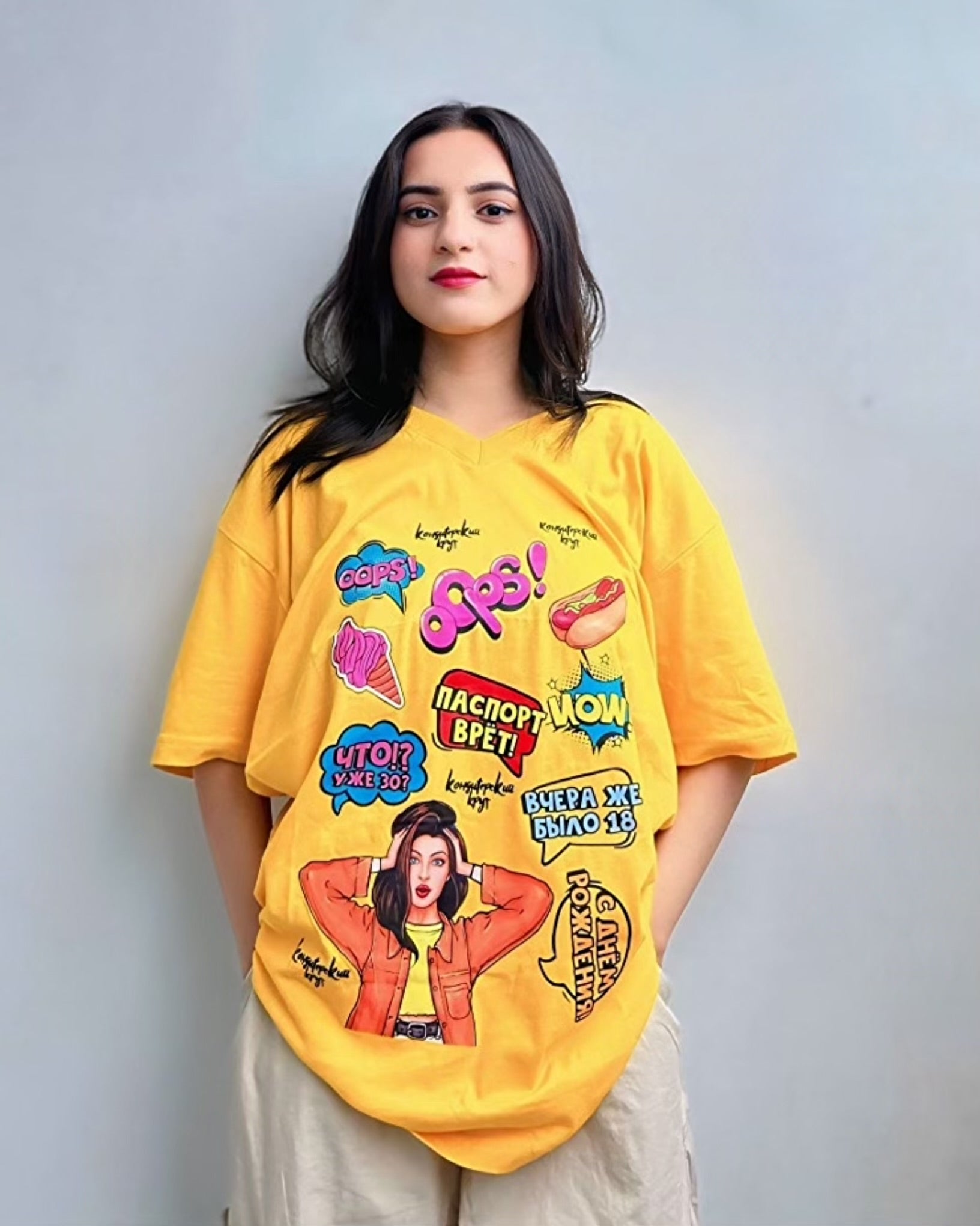π Gossip Girl Graphic Vneck Drop Shoulder Oversized Tee Yellow (100% off)